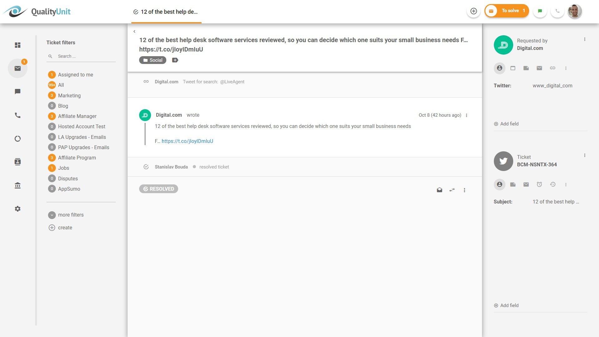 LiveAgent offers social media tagging.