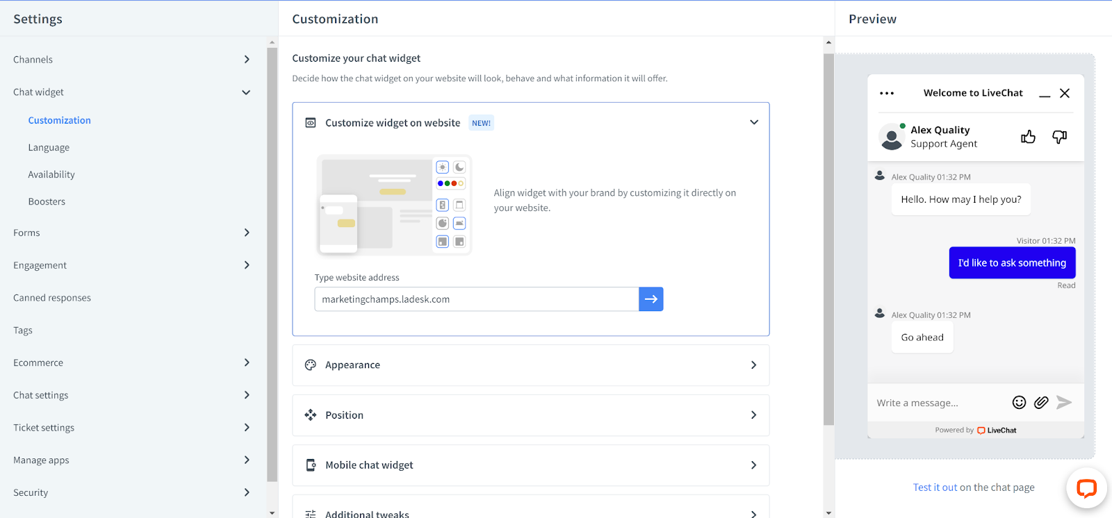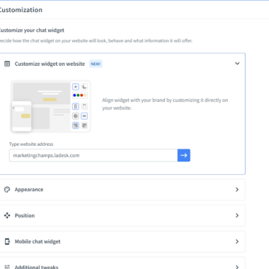 U kunt uw chatwidget aanpassen in de LiveChat-instellingen. De opties zijn behoorlijk uitgebreid, dus als u zin hebt om creatief aan de slag te gaan, kunt u de live chatwidget aanpassen aan uw voorkeuren of aan uw klantenbranding. Uw keuzes omvatten hoe uw venster eruit zal zien in gemaximaliseerde en geminimaliseerde weergave, licht of donker thema, themakleur (aangepaste kleur wordt ondersteund) en chatpositie. Er is ook de mogelijkheid om de widget te verbergen, de mobiele versie van uw chatwidget aan te passen en extra aanpassingen waarbij u het bedrijfslogo, de foto van een vertegenwoordiger kunt weergeven, geluiden kunt in- of uitschakelen, chatbeoordelingen kunt toestaan en nog een paar andere opties.