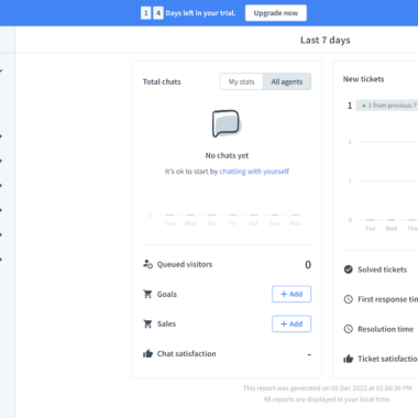De analysefuncties bieden een snel overzicht, evenals diepgaande overzichten van alles wat met de live chat te maken heeft: chats, vertegenwoordigers, klanten, tickets en ecommerce. Elke sectie kan u meer informatie en concrete cijfers geven over uw live chat. Er ontbreekt niets. Het analyseoverzicht geeft u een overzicht van alles wat er de afgelopen zeven dagen van uw gebruik is gebeurd.