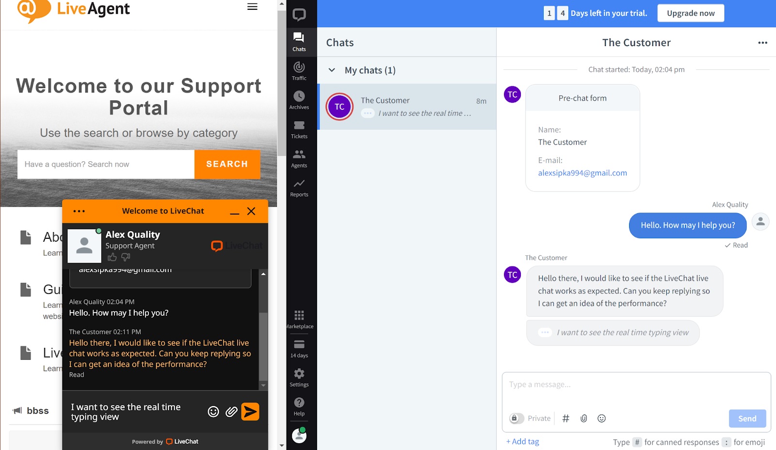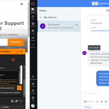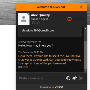 Ik heb de live chatwidget van LiveChat van beide kanten bekeken – vanuit het perspectief van zowel een vertegenwoordiger als een klant om de volledige ervaring te krijgen, en ik kan zeggen dat alles geweldig werkte, zoals verwacht. Toen ik als klant de chat startte, werd ik meteen begroet door een automatisch bericht (je kunt dit bericht aanpassen in de instellingen, onder Gerichte berichten). Met het LiveChat-dashboard open, kreeg ik meteen een visuele en een geluidsmelding over een nieuw inkomend bericht. Het browsertabblad blijft u ook een melding geven totdat u besluit erop te klikken. Tot nu toe, zo goed.