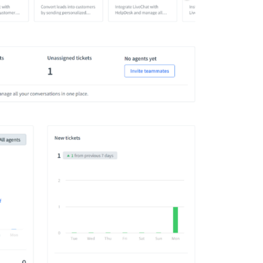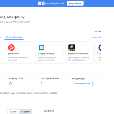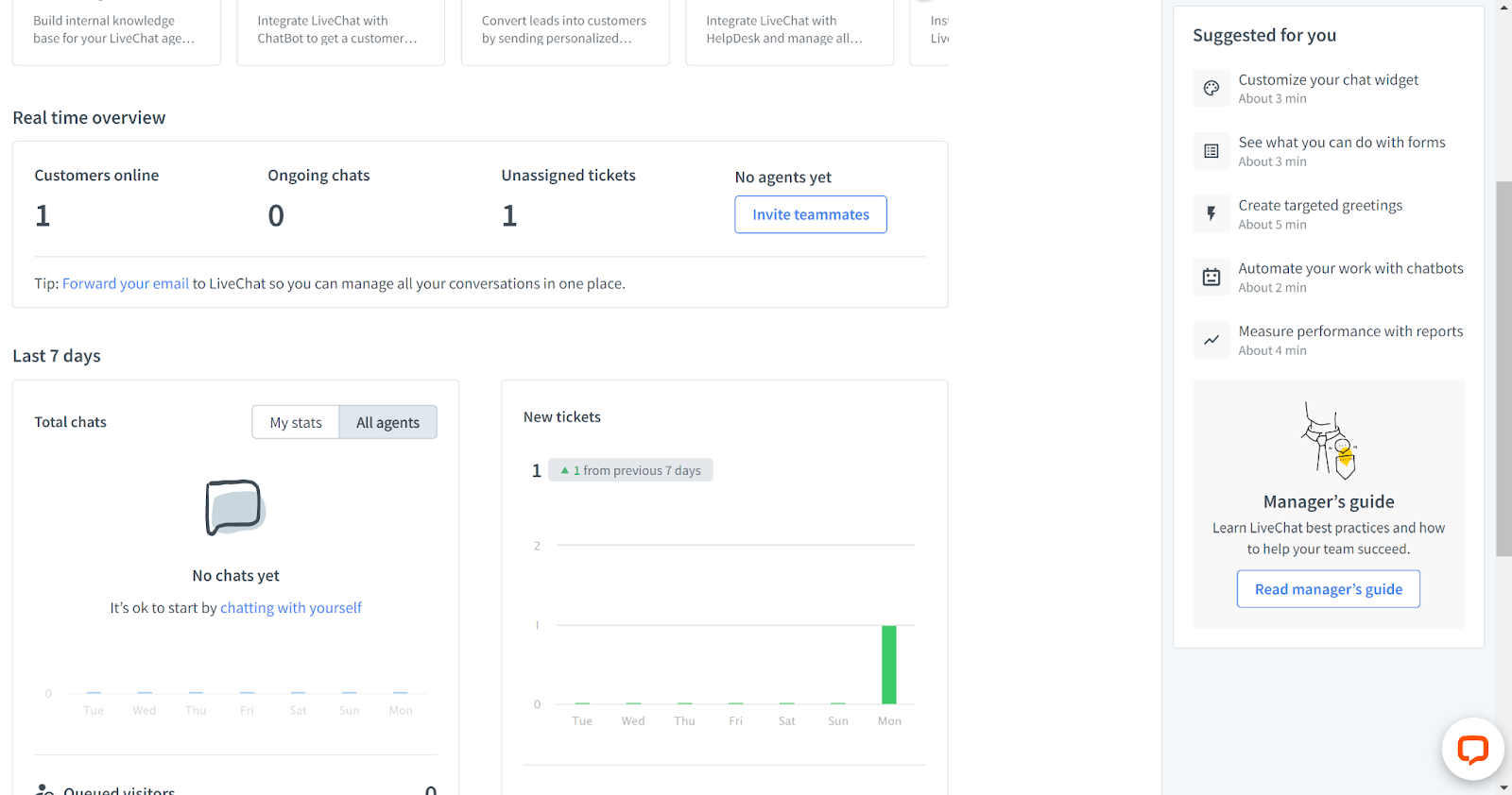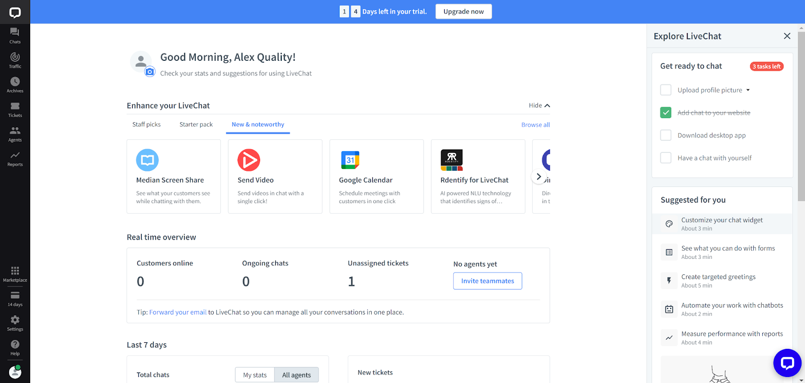 LiveChat is een gevestigde professionele oplossing en de interface volgt dat. Het is gemakkelijk om vertrouwd te raken met de meeste tools en u zult niet verdwalen dankzij de eenvoudige aanbevelingen in het rechterdeelvenster. U kunt chats, verkeer, tickets, archieven, contacten en meer bekijken in het menu aan de linkerkant. Het midden van het dashboard presenteert enkele verbeteropties en een snel realtime overzicht van live chatstatistieken.