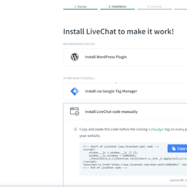 LiveChat-registratie is erg snel. U hoeft alleen uw account te registreren en het registratieproces brengt u uiteindelijk rechtstreeks naar het integratiegedeelte van de live chatwidget, wat betekent dat u uw live chat kunt implementeren zodra u begint. Dit is verrassend snel en LiveChat geeft u zelfs een aantal integratie-opties. U kunt kiezen tussen een WordPress-plug-in, Google Tag Manager of handmatige live chatcode-installatie.