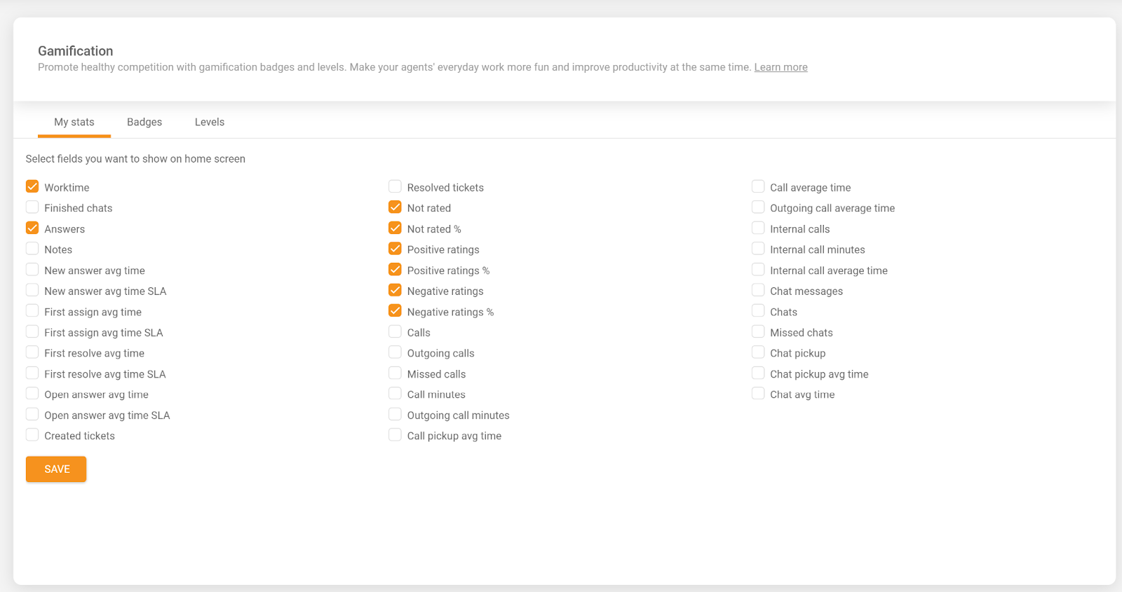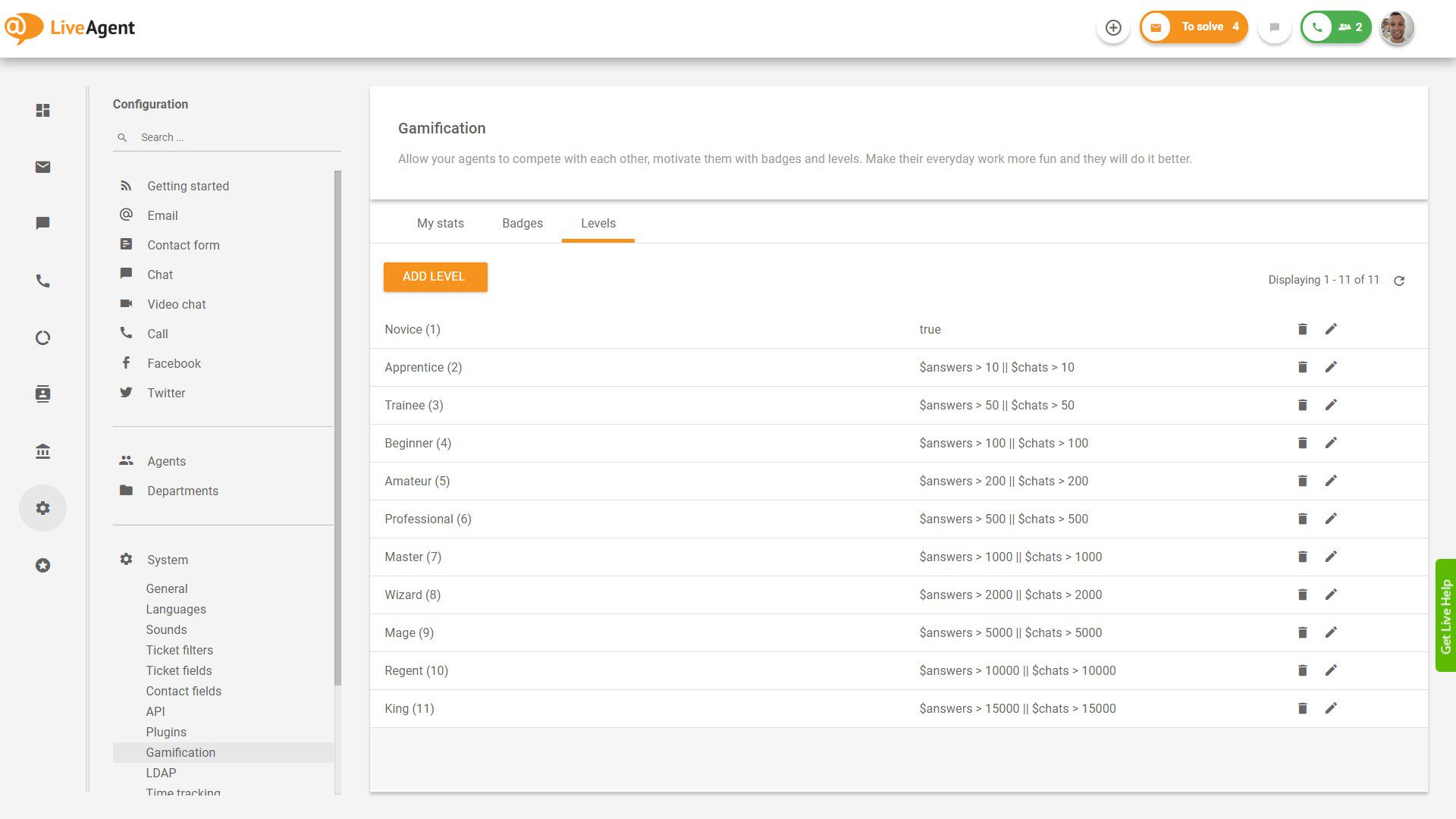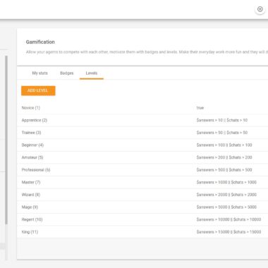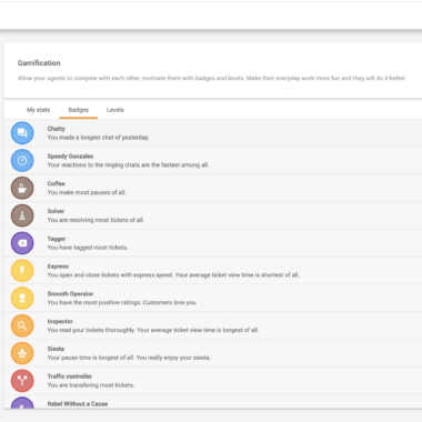 Eenmaal u alle drie gamification functies heeft ingesteld volgens uw voorkeuren, zal het systeem in LiveAgent beginnen met het volgen van vereiste gegevens volgens de criteria. Wanneer een agent aan bepaalde voorwaarden voldoet, zullen ze levelen of badges ontvangen. Dit proces is volledig geautomatiseerd, dus u hoeft verder niets te doen behalve de setup.