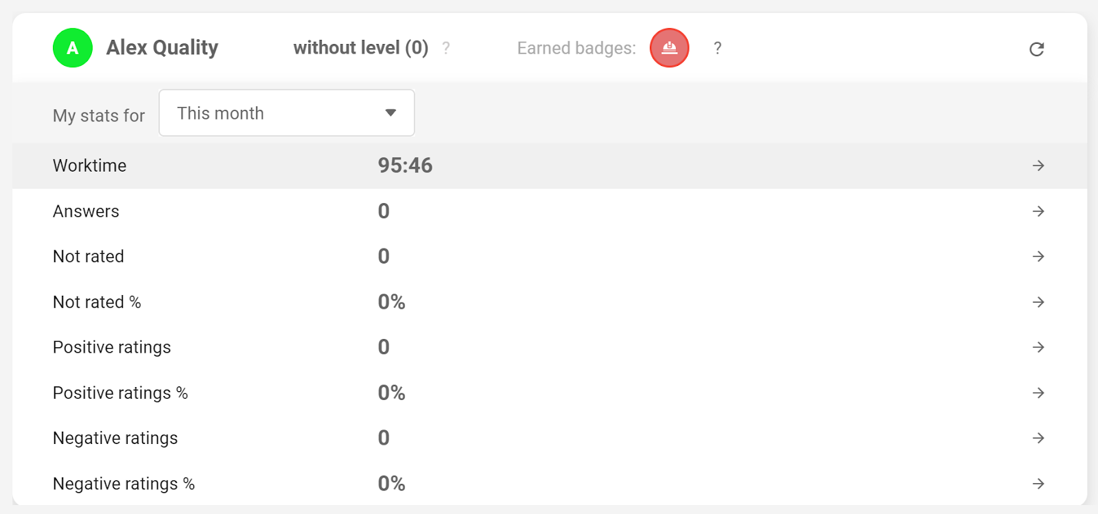 Alle statistieken, niveaus en badges zijn zichtbaar in het dashboard van elke agent in de linkerbenedenhoek van het scherm. U kunt ervoor kiezen om uw statistieken voor een bepaalde periode weer te geven. Door op elk item in de lijst te klikken, wordt een ranglijst onthuld met vergelijkingen van de prestaties van agenten. U kunt ook deze tabel vernieuwen om de nieuwste gegevens over uw statistieken en prestaties te zien.